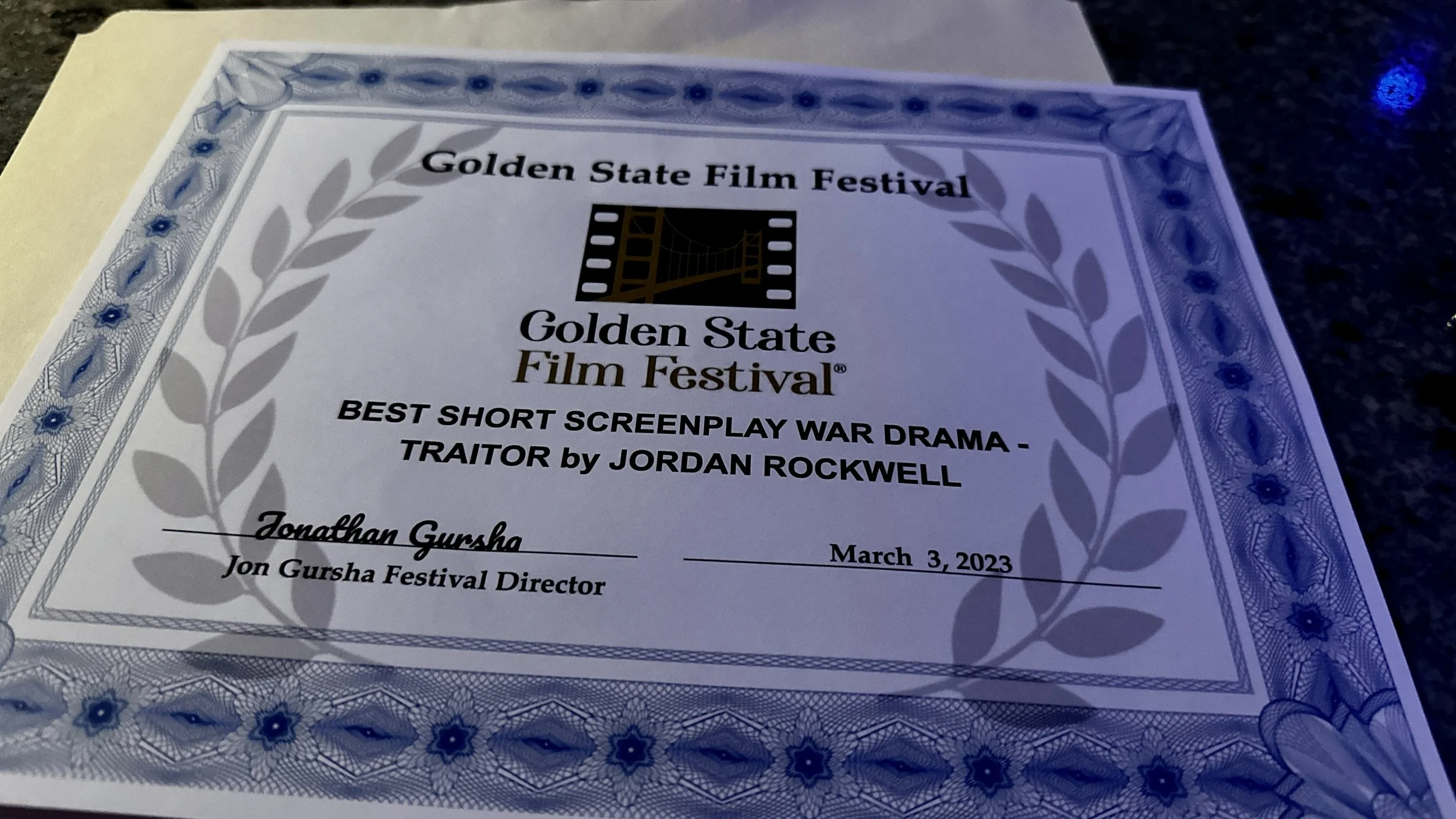 My short film script, “Traitor” took home another award, this one for, “Best Short Screenplay War Drama,” at the Golden State Film Festival! Here’s a teaser (I’m making this picture soon!)